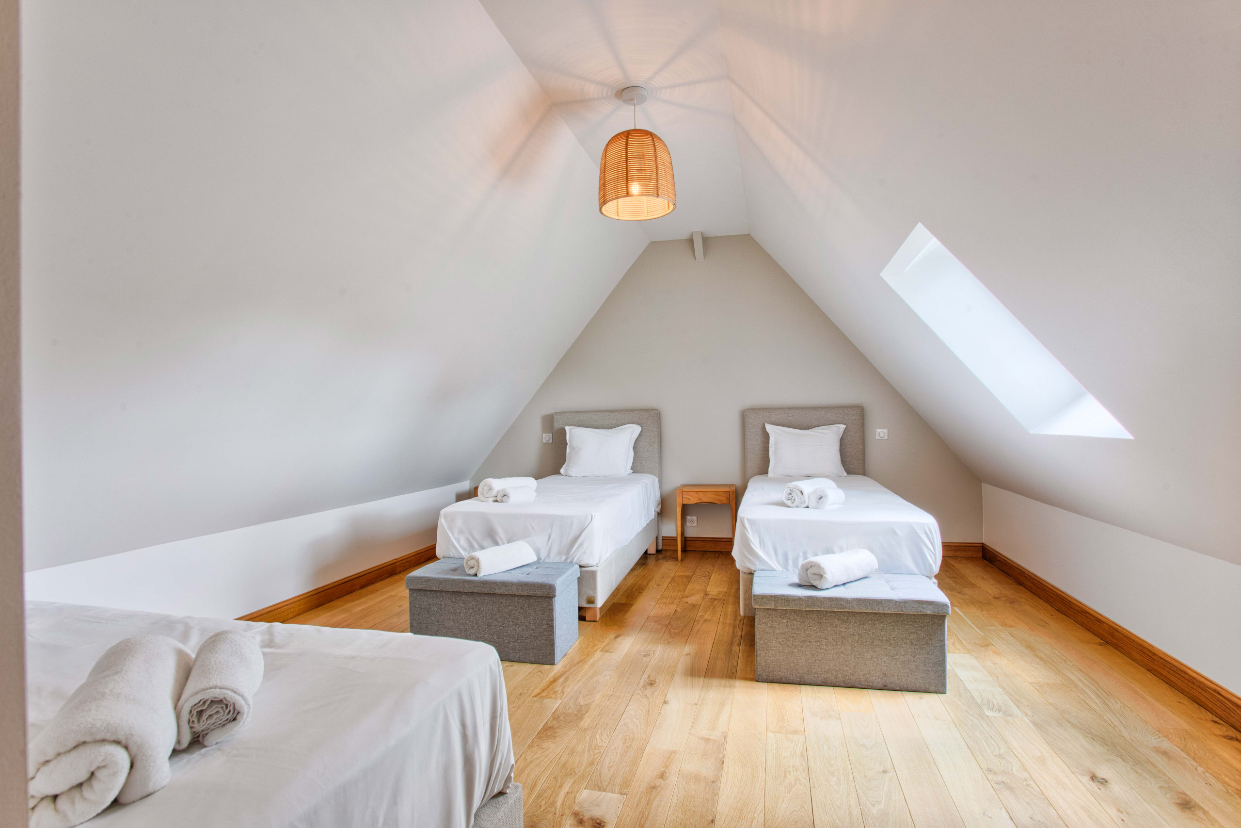It has 4 bedrooms in total, 3 bedrooms with double beds and one bedroom with 3 single beds as well as 3 bathrooms and 2 separate toilets.
