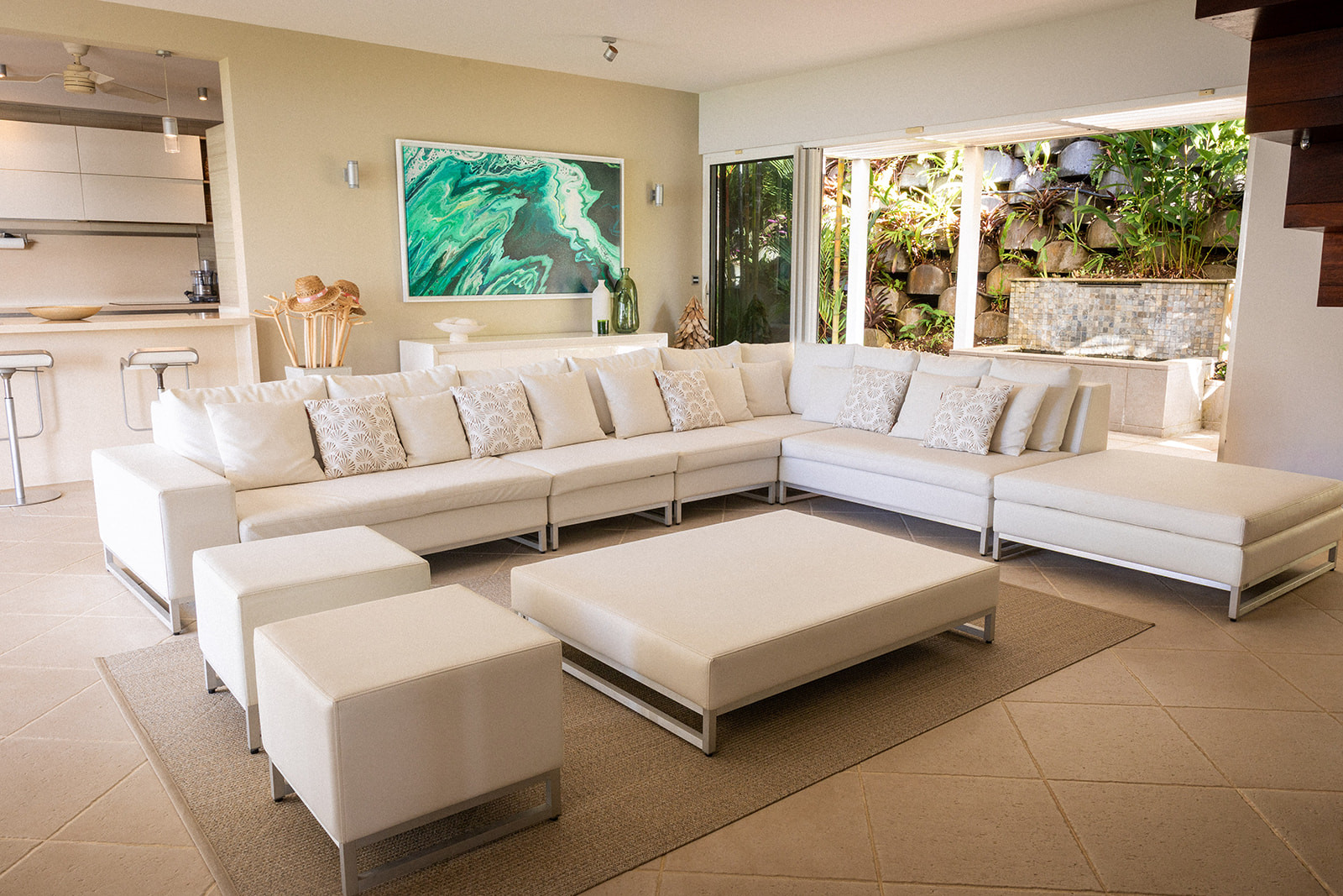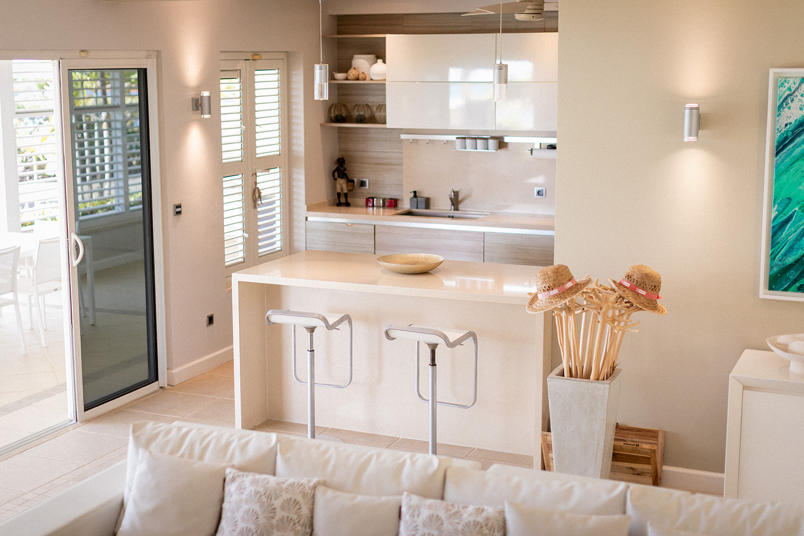 Cette villa au style créole moderne est composée d’une cuisine tout-équipée ouverte sur un salon confortable prolongée par une grande terrasse.