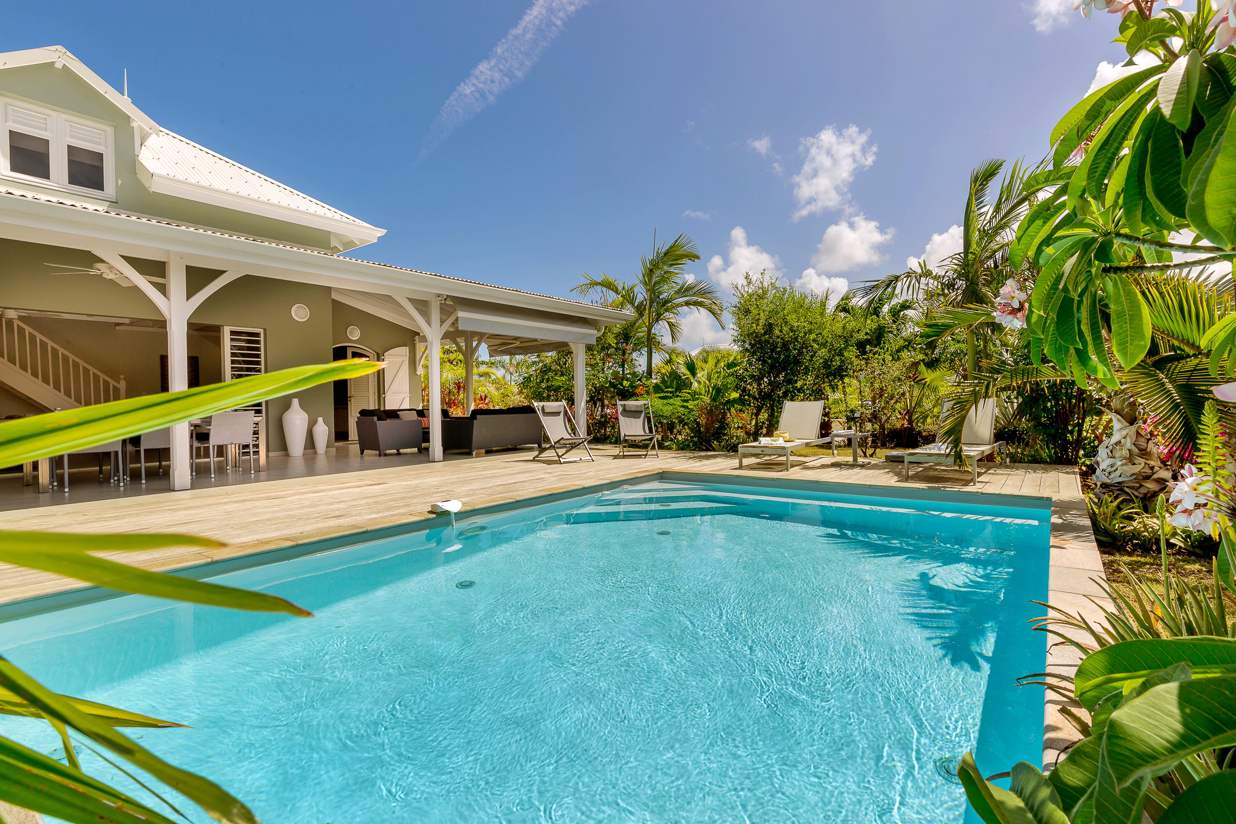 La piscine privée entourée d’un jardin créole vous permettre de vous prélasser sous le soleil des Antilles.