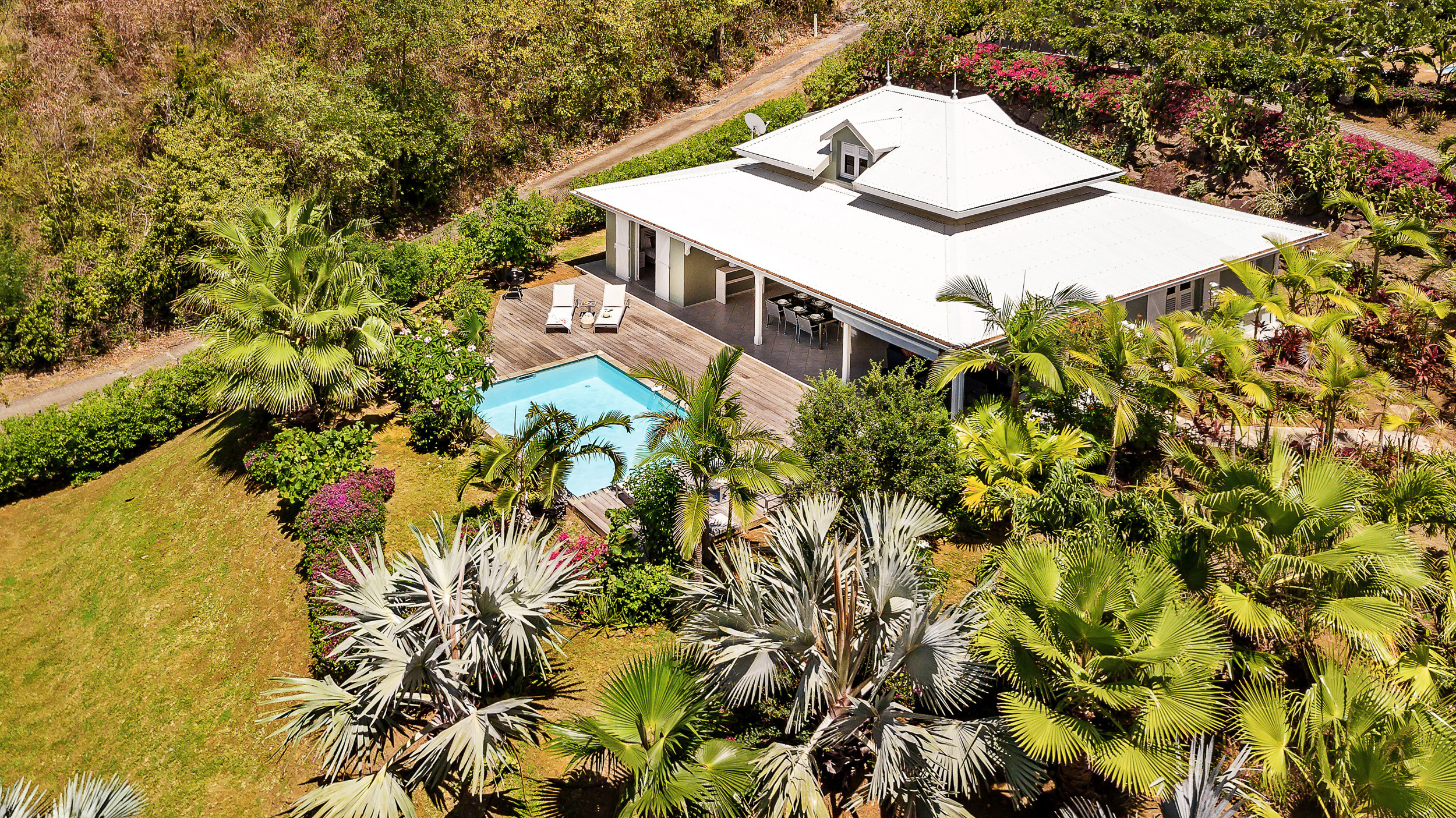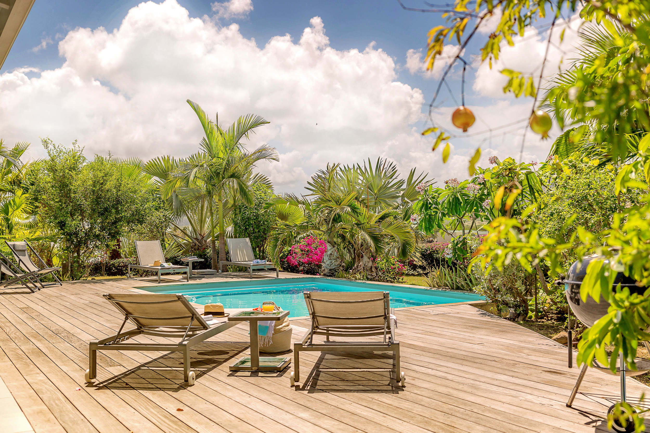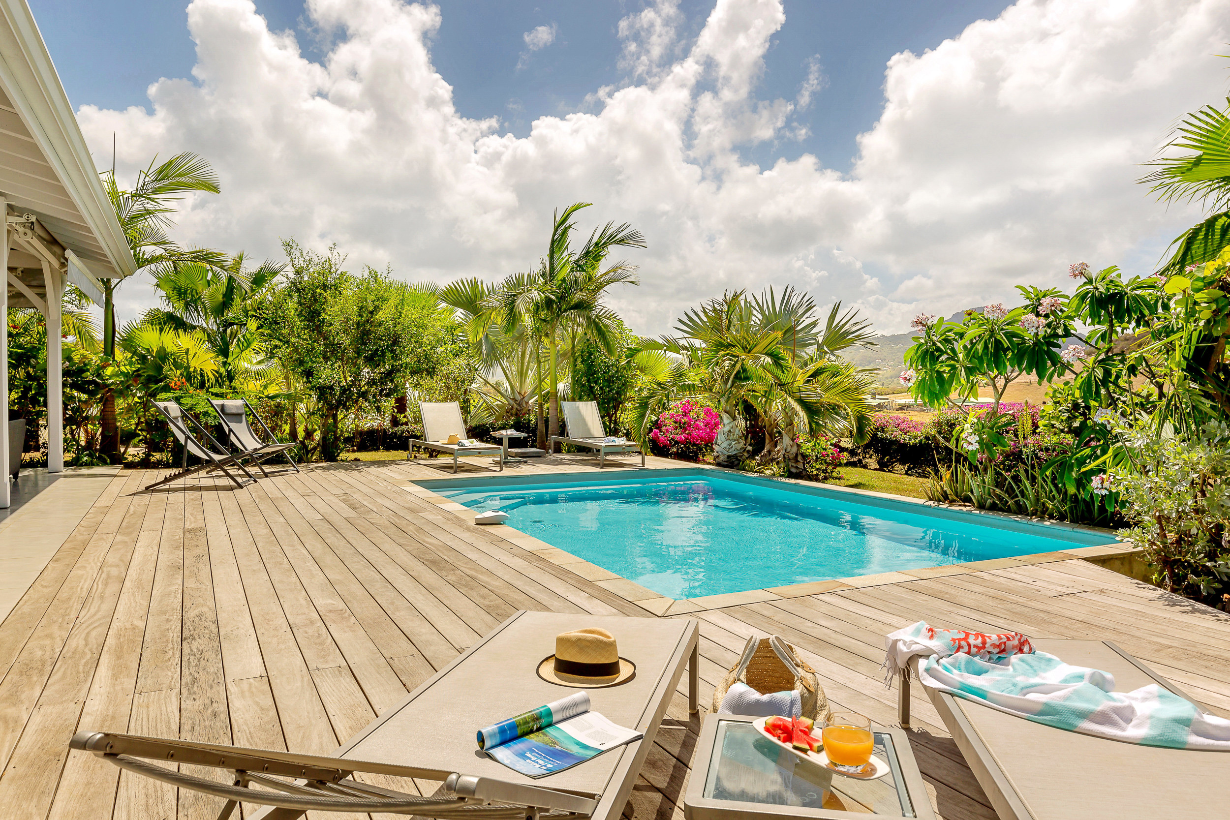La piscine privée et les bains de soleil vous permettront d'apprécier la douce chaleur des Antilles tout en bénéficiant de la tranquillité des lieux grâce à votre jardin privé.