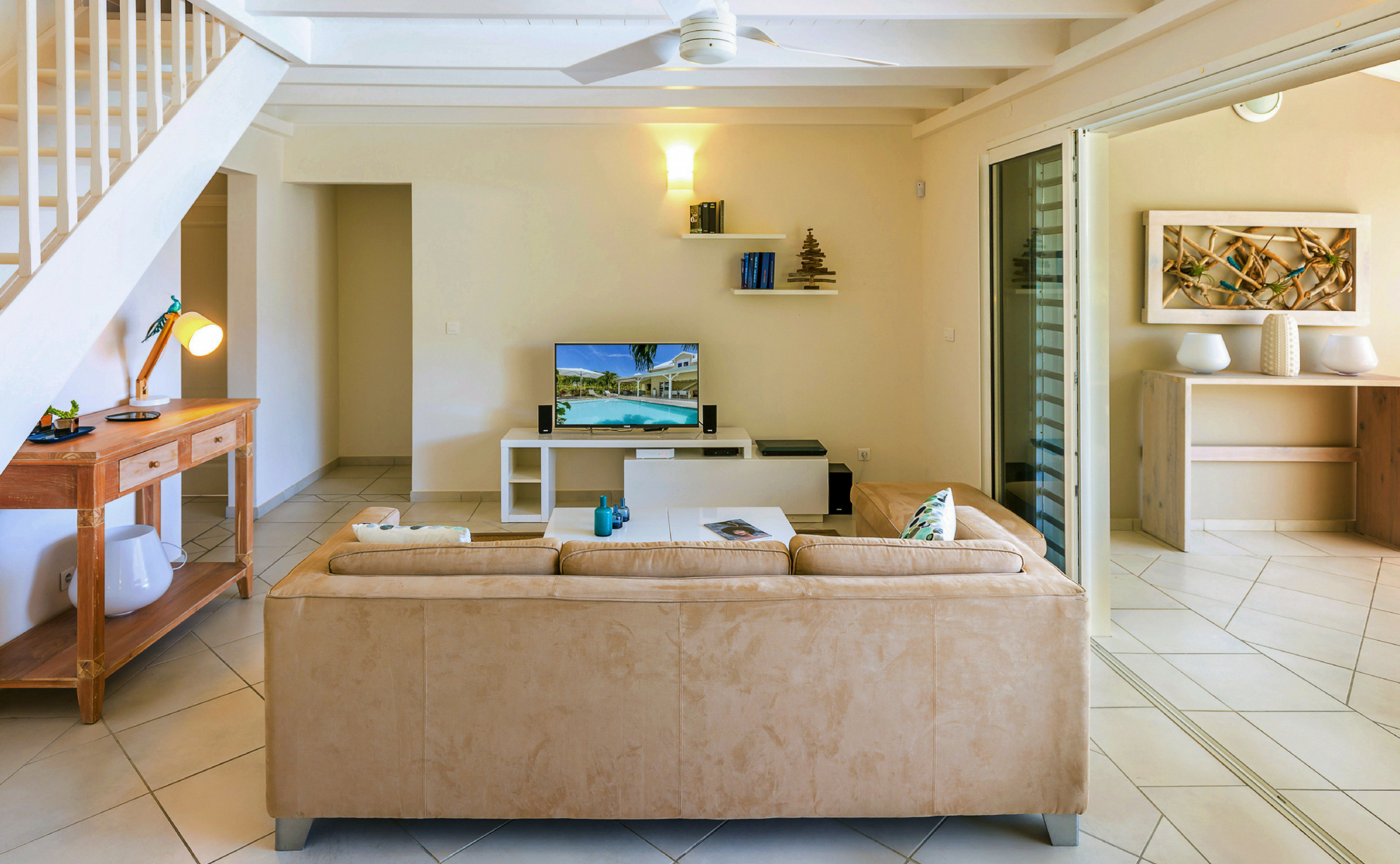 Le salon bien ventilé, s’ouvre sur la terrasse avec vue sur la piscine et le jardin créole. Il possède une télévision à écran plat avec des chaînes en français et en anglais, un lecteur DVD et un accès au wifi gratuit.
